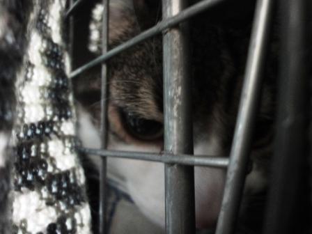 キャリーの奥の短辺にむりくり横向きに丸くなって自分の殻に閉じこもっていたが、